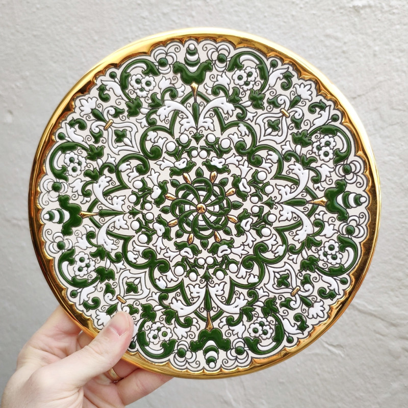 "Artecer" es el más prestigioso de los fabricantes de estos platos de cerámica Sevillanos. Estos platos están esmaltados con oro de 24 quilates. Es conocido como el trabajo de “cuerda seca”, que fue traído por los árabes en el siglo VIII a Andalucía. Desde entonces este trabajo artesanal se ha realizado en España.