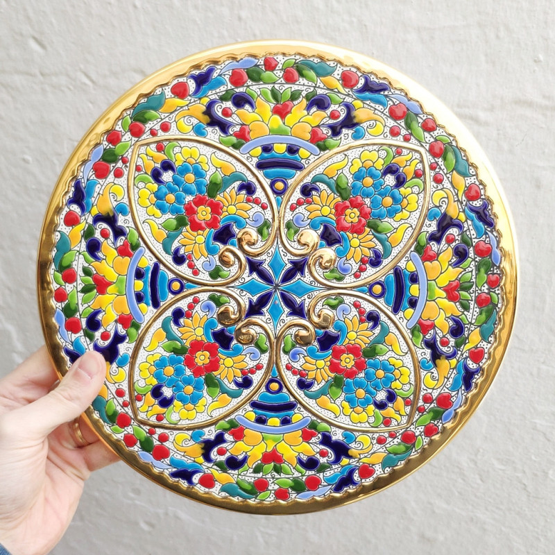 "Artecer" es el más prestigioso de los fabricantes de estos platos de cerámica Sevillanos. Estos platos están esmaltados con oro de 24 quilates. Es conocido como el trabajo de “cuerda seca”, que fue traído por los árabes en el siglo VIII a Andalucía. Desde entonces este trabajo artesanal se ha realizado en España.