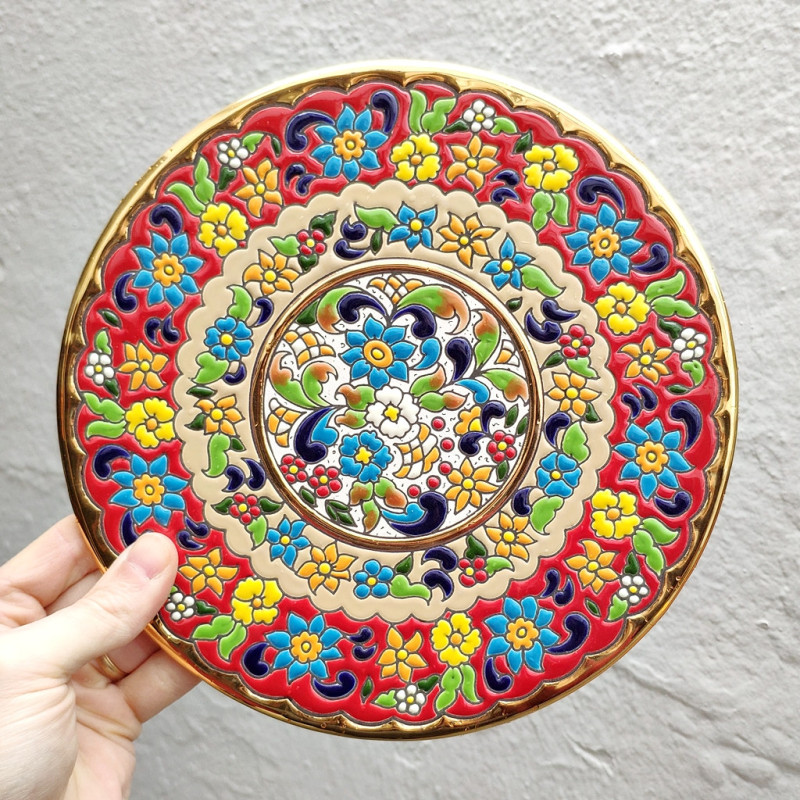 "Artecer" es el más prestigioso de los fabricantes de estos platos de cerámica Sevillanos. Estos platos están esmaltados con oro de 24 quilates. Es conocido como el trabajo de “cuerda seca”, que fue traído por los árabes en el siglo VIII a Andalucía. Desde entonces este trabajo artesanal se ha realizado en España.