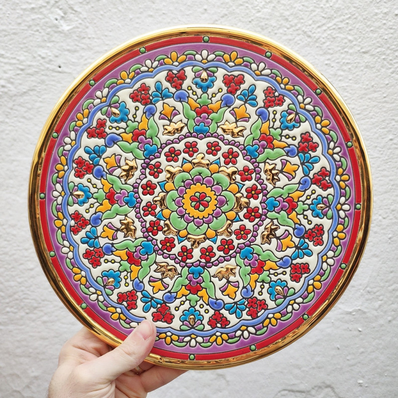 Certificamos que esta pieza pintada en cuerda seca está realizada a mano y acabada en oro de 24Kl.