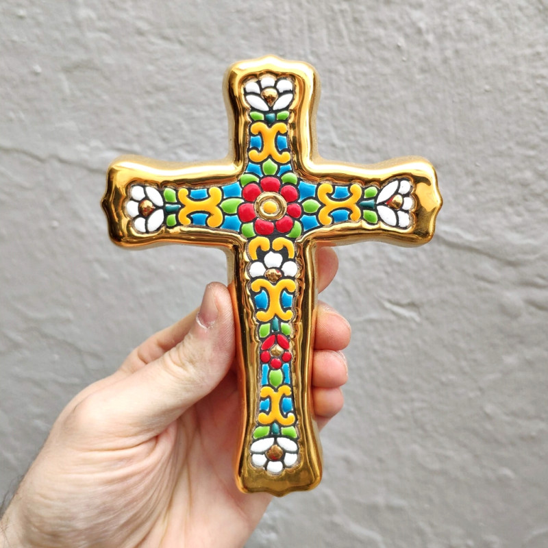 Cruz de cerámica con oro - 15 cm. - "Cuerda seca" - 24k Gold/Oro - Hecho en Sevilla, Andalucía -