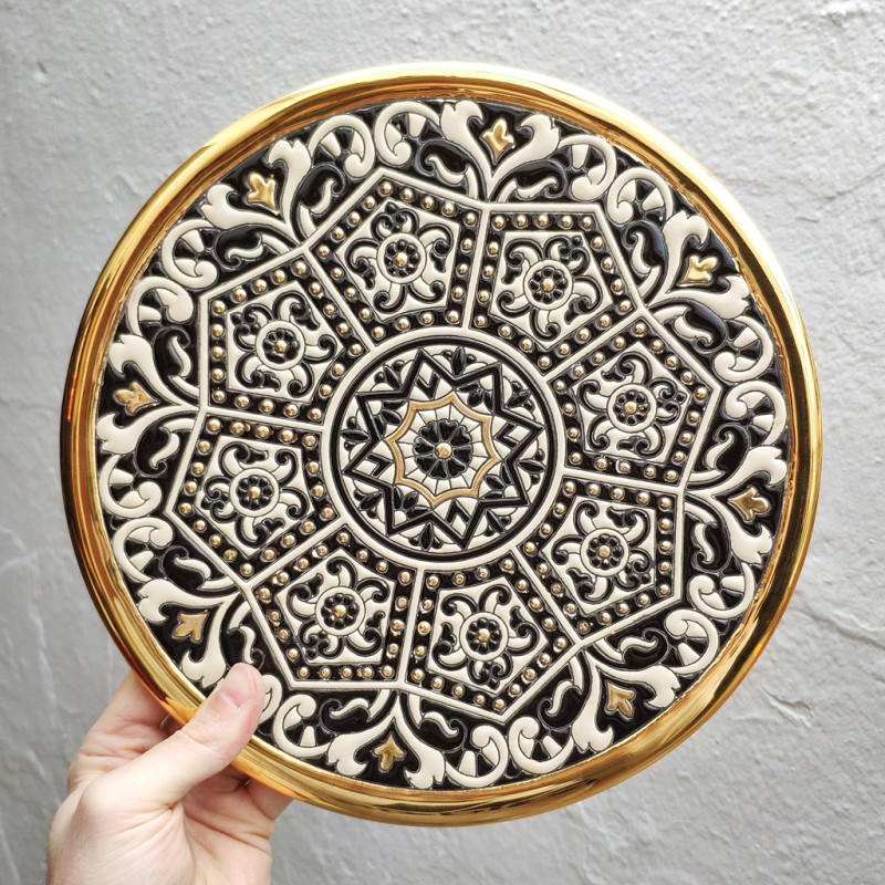"Artecer" es el más prestigioso de los fabricantes de estos platos de cerámica Sevillanos. Estos platos están esmaltados con oro de 24 quilates. Es conocido como el trabajo de “cuerda seca”, que fue traído por los árabes en el siglo VIII a Andalucía. Desde entonces este trabajo artesanal se ha realizado en España.