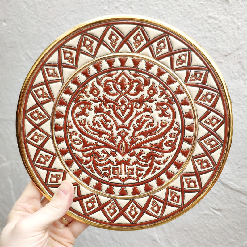 "Artecer" es el más prestigioso de los fabricantes de estos platos de cerámica Sevillanos. Estos platos están esmaltados con oro de 24 quilates. Es conocido como el trabajo de “cuerda seca”, que fue traído por los árabes en el siglo VIII a Andalucía. Desde entonces este trabajo artesanal se ha realizado en España.