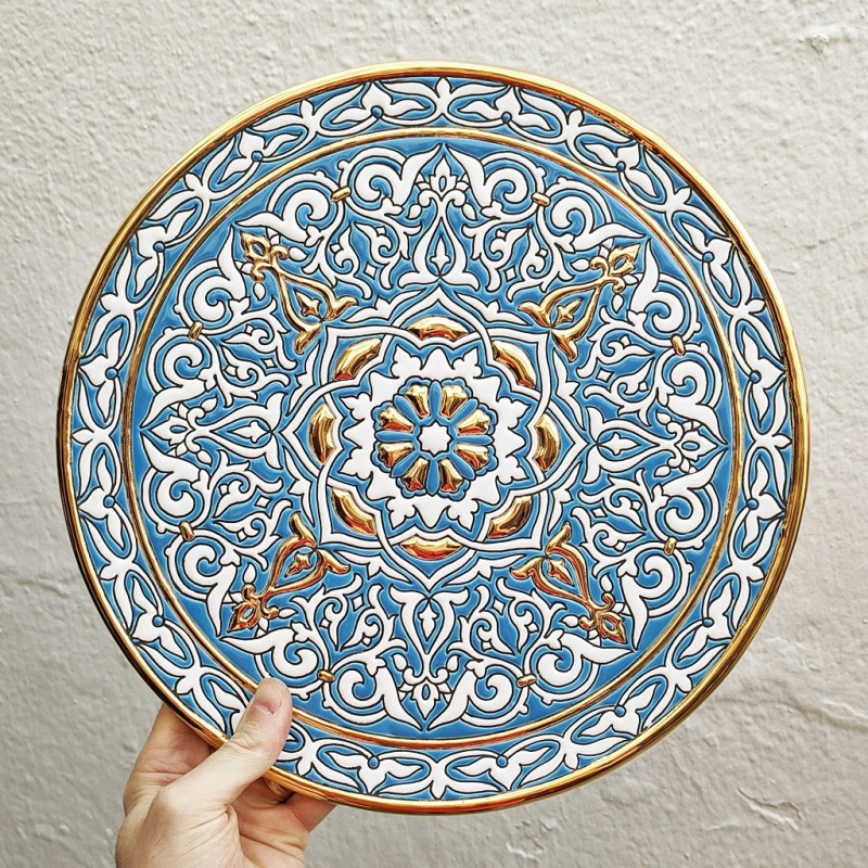 "Artecer" es el más prestigioso de los fabricantes de estos platos de cerámica Sevillanos. Estos platos están esmaltados con oro de 24 quilates. Es conocido como el trabajo de “cuerda seca”, que fue traído por los árabes en el siglo VIII a Andalucía. Desde entonces este trabajo artesanal se ha realizado en España.