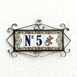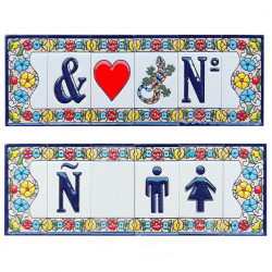 Letreros con números y letras en azulejo de cerámica policromada, pintados a mano en técnica cuerda seca para placas con nombres, direcciones y señalética. Texto personalizable.