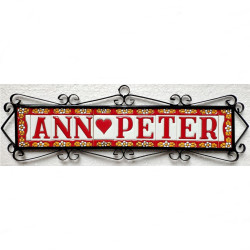 Enseignes avec chiffres et lettres en céramique polychrome, peintes à la main en technique corde sèche pour assiettes avec noms, adresses et signalétique. Texte personnalisable.