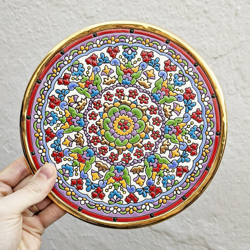 "Artecer" est le plus prestigieux des fabricants de ces assiettes en céramique de Séville. Ces assiettes sont émaillées à l'or 24 carats. Il est connu comme le travail de la "corde sèche", qui a été apporté par les Arabes au 8ème siècle en Andalousie. Depuis lors, ce savoir-faire a été réalisé en Espagne.
