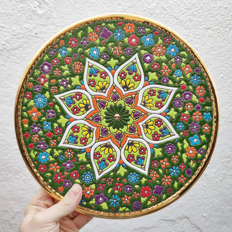 "Artecer" est le plus prestigieux des fabricants de ces assiettes en céramique de Séville. Ces assiettes sont émaillées à l'or 24 carats. Il est connu comme le travail de la "corde sèche", qui a été apporté par les Arabes au 8ème siècle en Andalousie. Depuis lors, ce savoir-faire a été réalisé en Espagne.