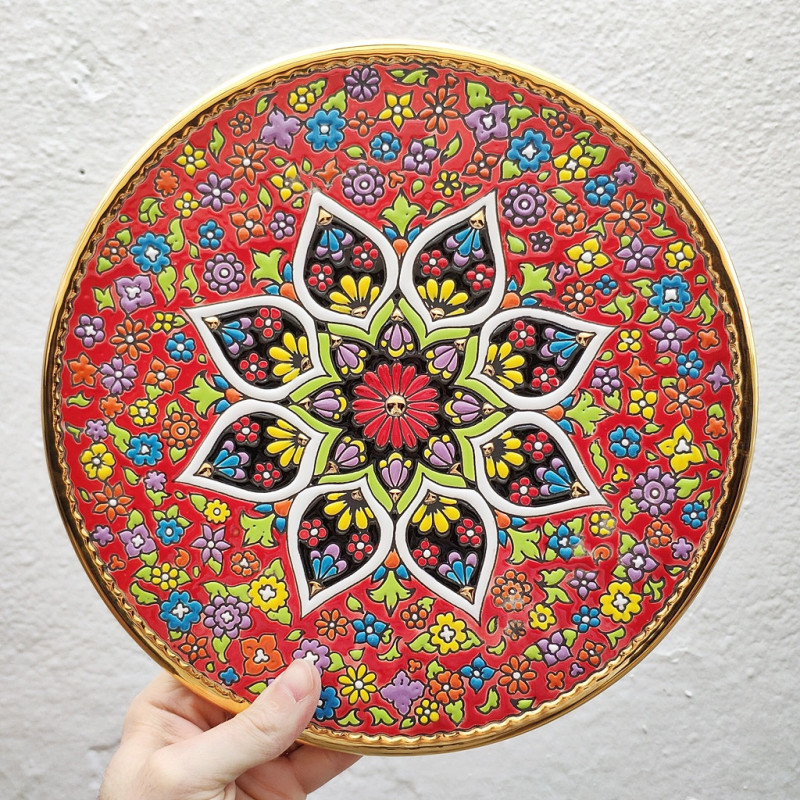 "Artecer" est le plus prestigieux des fabricants de ces assiettes en céramique de Séville. Ces assiettes sont émaillées à l'or 24 carats. Il est connu comme le travail de la "corde sèche", qui a été apporté par les Arabes au 8ème siècle en Andalousie. Depuis lors, ce savoir-faire a été réalisé en Espagne.