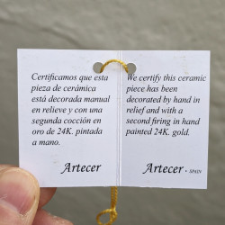 "Artecer" est le plus prestigieux des fabricants de ces assiettes en céramique de Séville. Ces assiettes sont émaillées à l'or 24 carats. Il est connu comme le travail de la "corde sèche", qui a été apporté par les Arabes au 8ème siècle en Andalousie. Depuis lors, ce savoir-faire a été réalisé en Espagne.