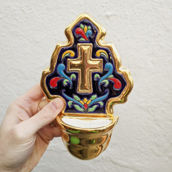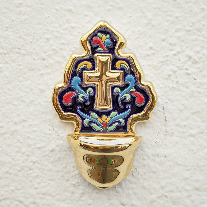 Fountaine d'eau bénite en céramique - 21 cm. (8") - "Corde sèche" - Or 24 carats - Fabriqué à Séville, Andalousie -