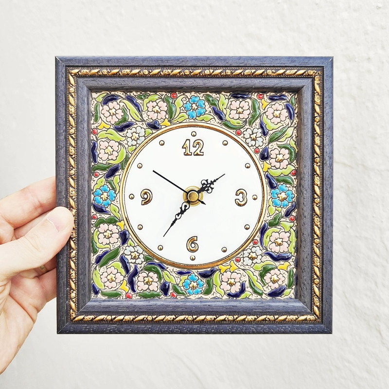 Horloge en céramique avec cadre en bois.