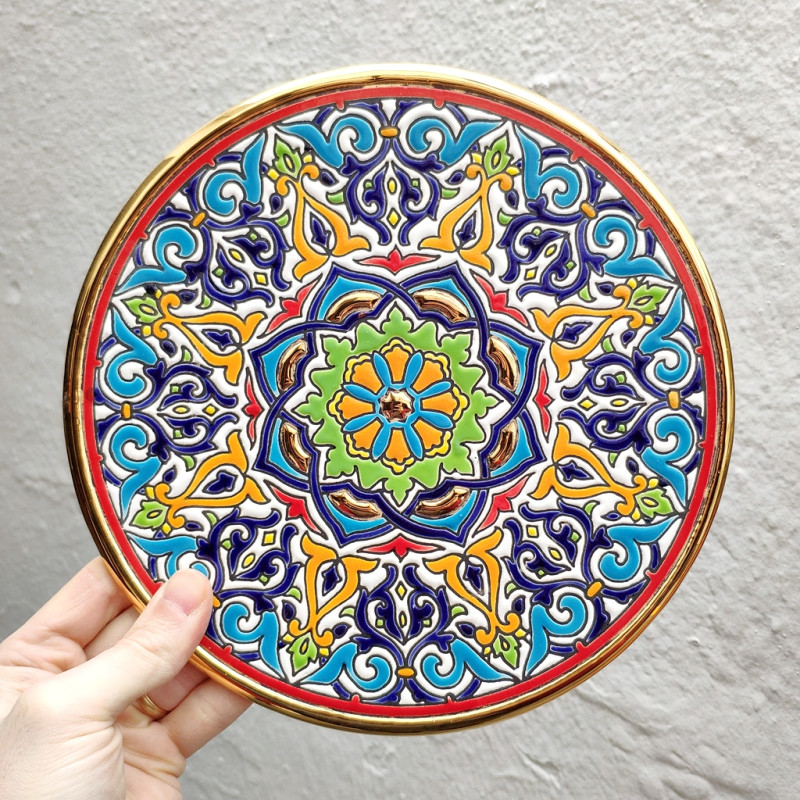 "Artecer" est le plus prestigieux des fabricants de ces assiettes en céramique de Séville. Ces assiettes sont émaillées à l'or 24 carats. Il est connu comme le travail de la "corde sèche", qui a été apporté par les Arabes au 8ème siècle en Andalousie. Depuis lors, ce savoir-faire a été réalisé en Espagne.
