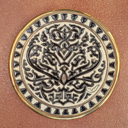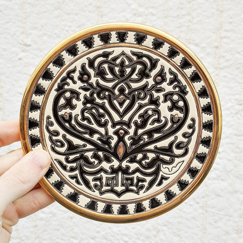 "Artecer" est le plus prestigieux des fabricants de ces assiettes en céramique de Séville. Ces assiettes sont émaillées à l'or 24 carats. Il est connu comme le travail de la "corde sèche", qui a été apporté par les Arabes au 8ème siècle en Andalousie. Depuis lors, ce savoir-faire a été réalisé en Espagne.