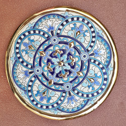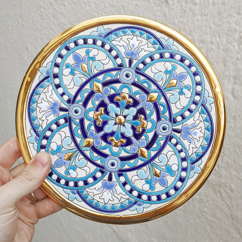 "Artecer" est le plus prestigieux des fabricants de ces assiettes en céramique de Séville. Ces assiettes sont émaillées à l'or 24 carats. Il est connu comme le travail de la "corde sèche", qui a été apporté par les Arabes au 8ème siècle en Andalousie. Depuis lors, ce savoir-faire a été réalisé en Espagne.