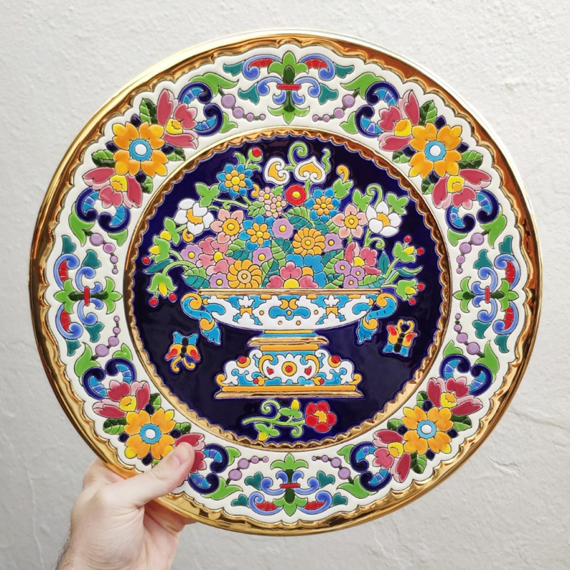 "Artecer" est le plus prestigieux des fabricants de ces assiettes en céramique de Séville. Ces assiettes sont émaillées à l'or 24 carats. Il est connu comme le travail de la "corde sèche", qui a été apporté par les Arabes au 8ème siècle en Andalousie. Depuis lors, ce savoir-faire a été réalisé en Espagne.