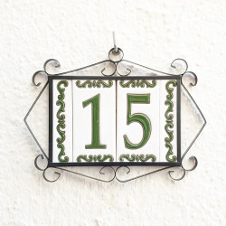 Panneaux avec chiffres et lettres en céramique polychrome, peints à la main en technique corde sèche pour plaques avec noms, directions et signalisation. Texte personnalisable.