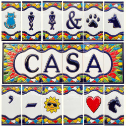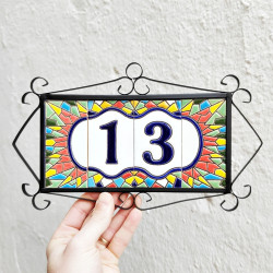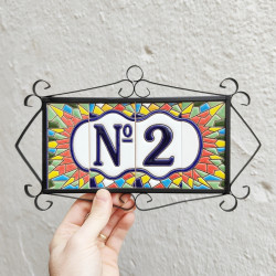 Panneaux avec chiffres et lettres en céramique polychrome, peints à la main en technique corde sèche pour plaques avec noms, directions et signalisation. Texte personnalisable.