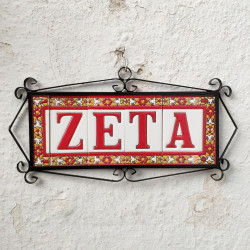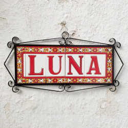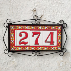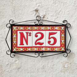 Signs with numbers and letters in polychrome ceramic tiles, hand-painted for making names, directions and signaling. Customizable text.