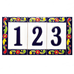 • Signs with numbers and letters on polychrome ceramic tiles, hand-painted using the cuerda seca technique for nameplates, addresses, and signage.